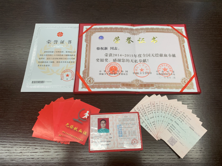 徐祝新于2014、2015年度获得全国献血银奖,2016、2017年度获得全国献血金奖(献血达8000cc),省内仅3000余人获此殊荣。此外,他的夫人也是全国铜奖(献血达4000cc)的获得者。
